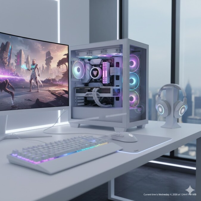 Tren rakitan PC saat ini telah bergeser dari sekadar performa menjadi sebuah karya seni meja kerja. Salah satu gaya yang paling diminati adalah “All-White Build”. PC gaming berwarna putih memberikan kesan bersih, mewah, dan mampu memantulkan cahaya RGB dengan jauh lebih maksimal dibandingkan casing hitam konvensional.